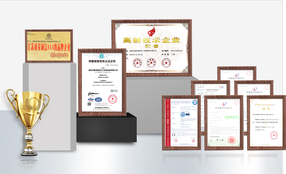 榮獲30余項實用新型和外觀專利證書,乳化機(jī)/灌裝機(jī)等多款產(chǎn)品被認(rèn)定為高新技術(shù)產(chǎn)品